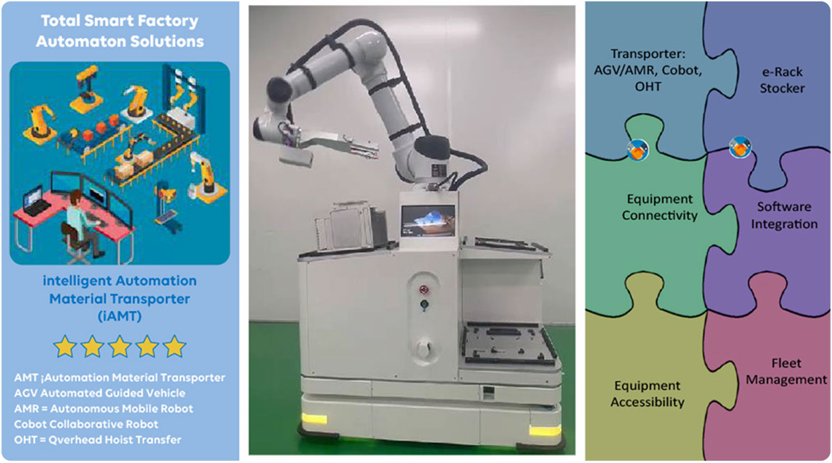 Provide Total Smart Factory Automation to enable AMR+Cobot for auto load/unload, fleet management system, smart rack, machine modification e.g. auto door open/close, cassette modification, load port & machine communication (SECS/GEM & Non-SECS/GEM), WIP/MES interface, etc